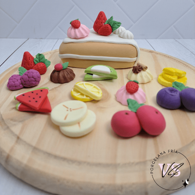 (2 bananas, 2 kiwis, 2 arándanos, 2 frutillas, 2 cerezas, 2 moritas, 2 sandías, 2 limones, 2 Ananá, 2 merenguitos de fresa, 2 merenguitos de chocolate , 2 merenguitos de crema)